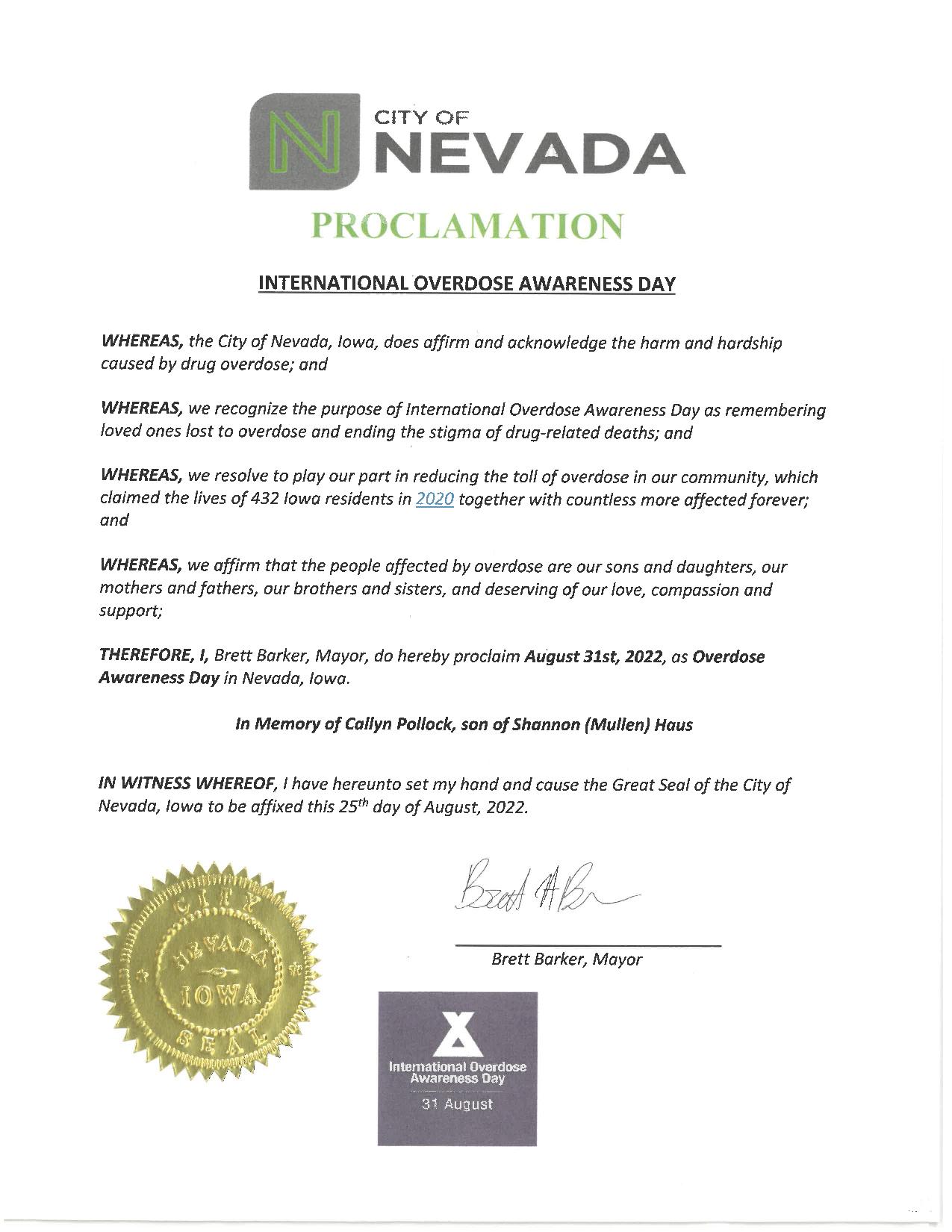This Wednesday, Aug. 31, Mayor Brett Barker has proclaimed it to be International Overdose Awareness Day in the City of Nevada, IA, recognizing the harm