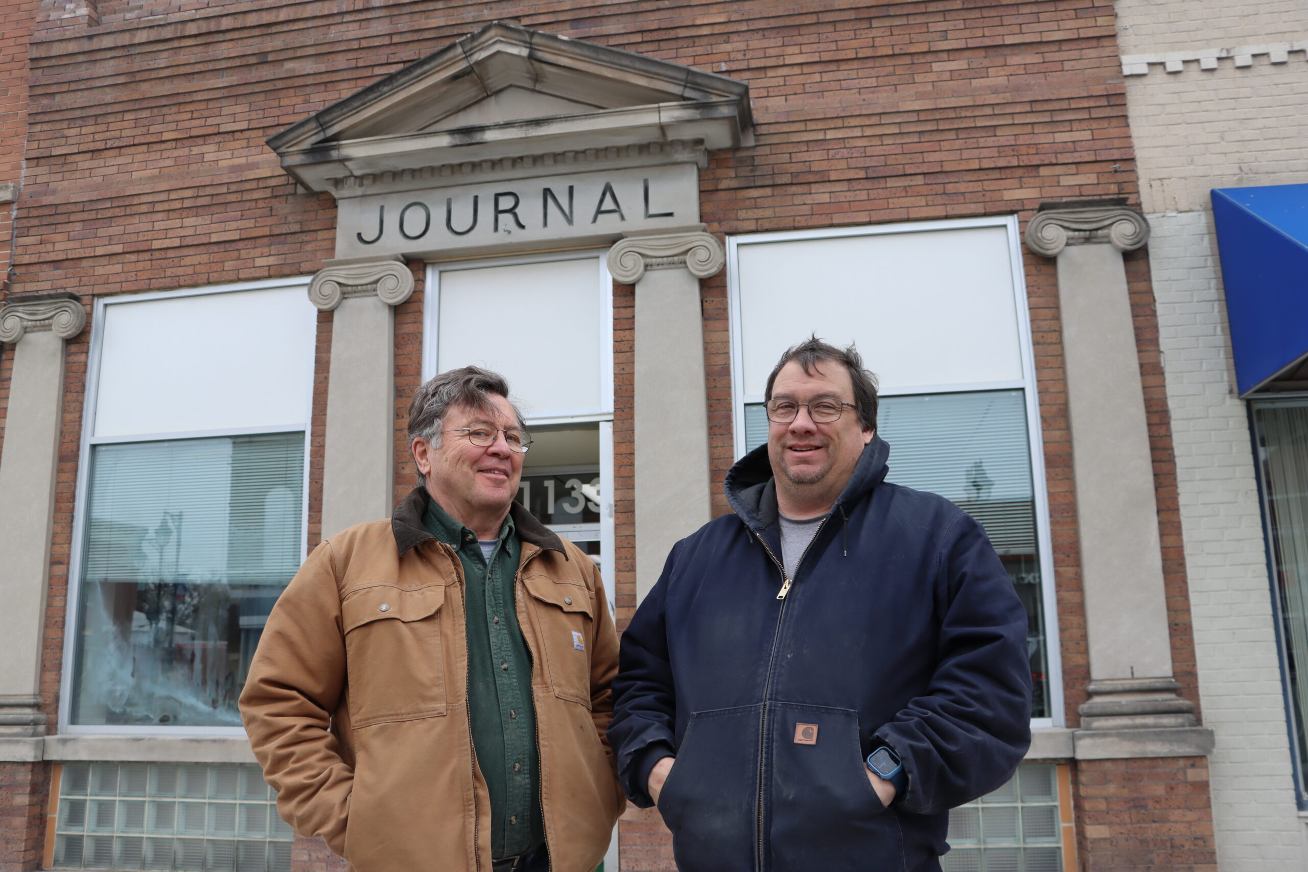 Tom Richards, left, owner of the building, and Mark Pleis, restauranteer, stand in front of the historic Nevada Journal building in the Main Street District.