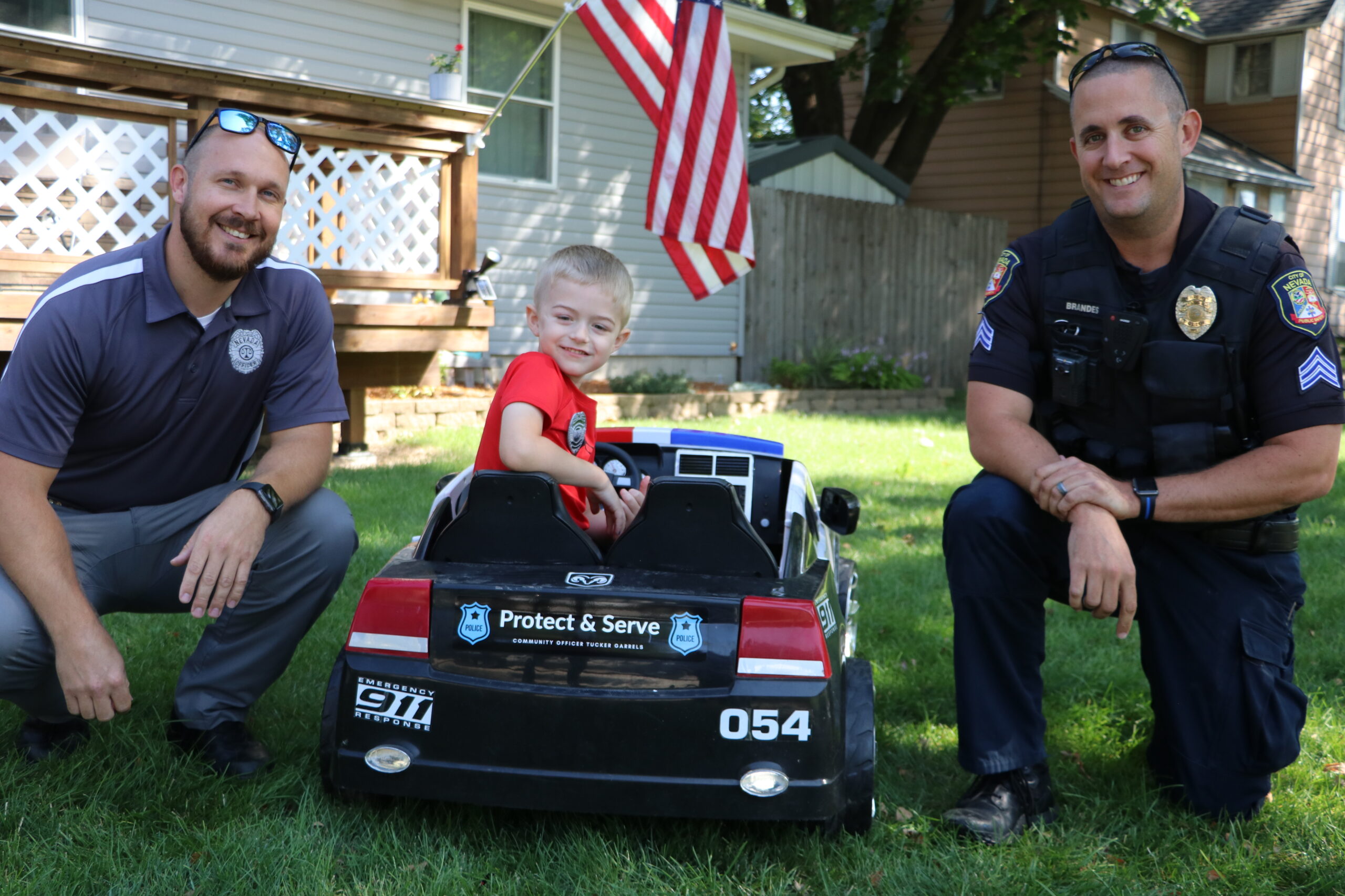 Nevada Police Sgts. Andrew Henderson (left) and Chris Brandes pose for a picture with Tucker Garrels, who has been designated as Nevada’s newest little “community