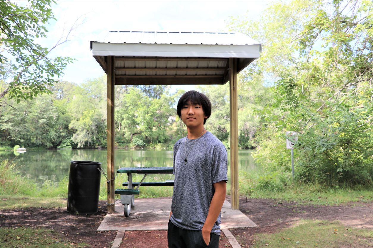 Nick Frideres stands in front of the new shelter erected for his Eagle Scout Project and finished earlier this month. A Nevada High School