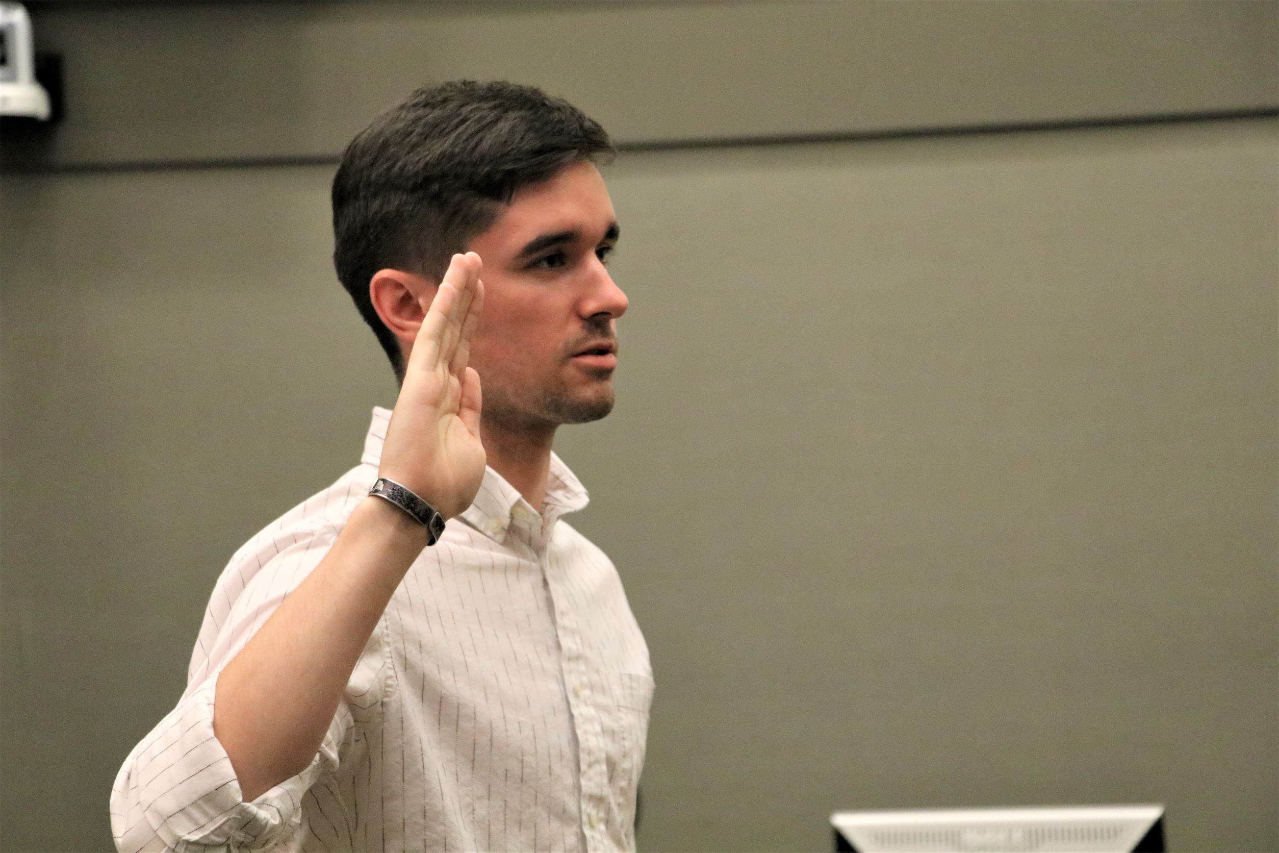 Nicholas Walleser was sworn in as a police officer during the Aug. 23 City Council meeting. Below, Mayor Brett Barker congratulates him after the oath