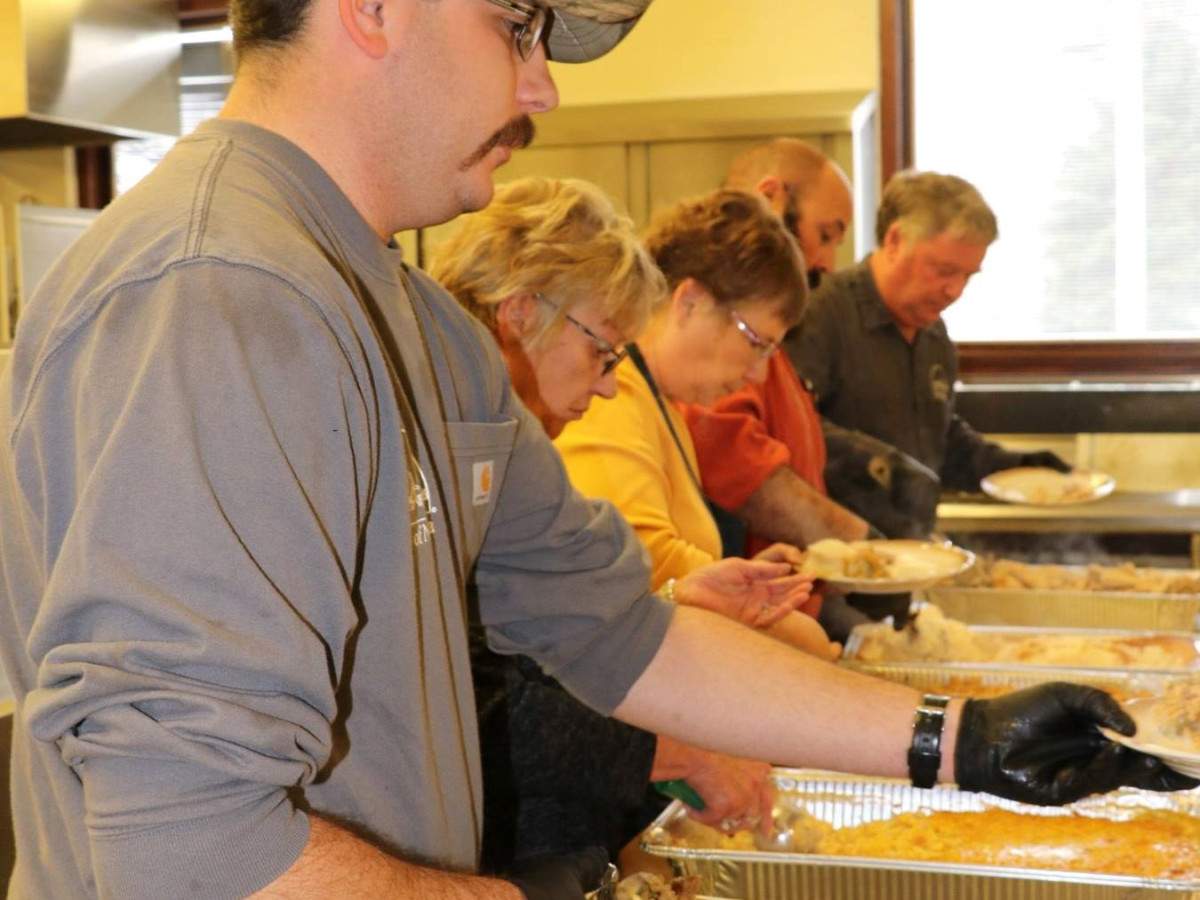 In this picture, from the 2018 Thanksgiving dinner, City employees and volunteers line up to help prepare plates. This year’s meal will also be provided
