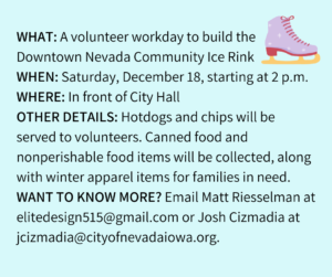 This Saturday, bring your enthusiasm, questions and appetite to the City Hall campus, and be able to brag that you were part of setting up the new Downtown Nevada Community Ice Rink.