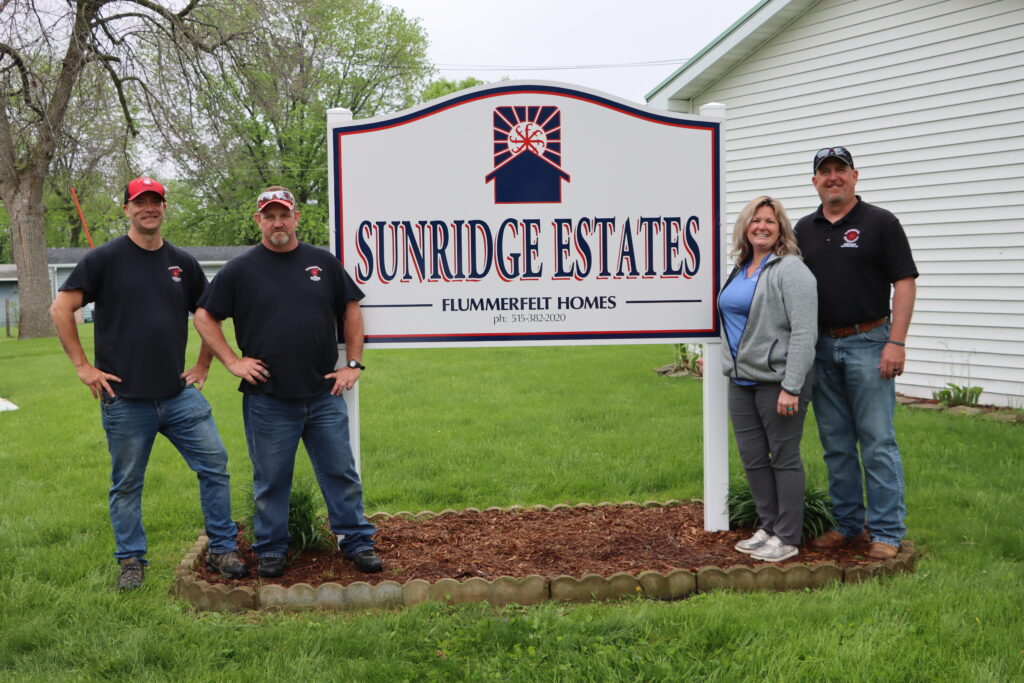 New Sunridge Estates signs went up at the 10th Street entrances to the manufactured homes community in Nevada today. Pictured are a few of the Flummerfelt Homes Team: (from left) Jordan Jones, grounds & maintenance; Rob Ellsworth, assistant manager; April Clendenen, lead sales; and Jeff Clendenen, general manager. Other Flummerfelt Homes team members include Mike Flummerfelt, owner; Matt Flummerfelt, sales & management; Diane Flummerfelt, office manager;