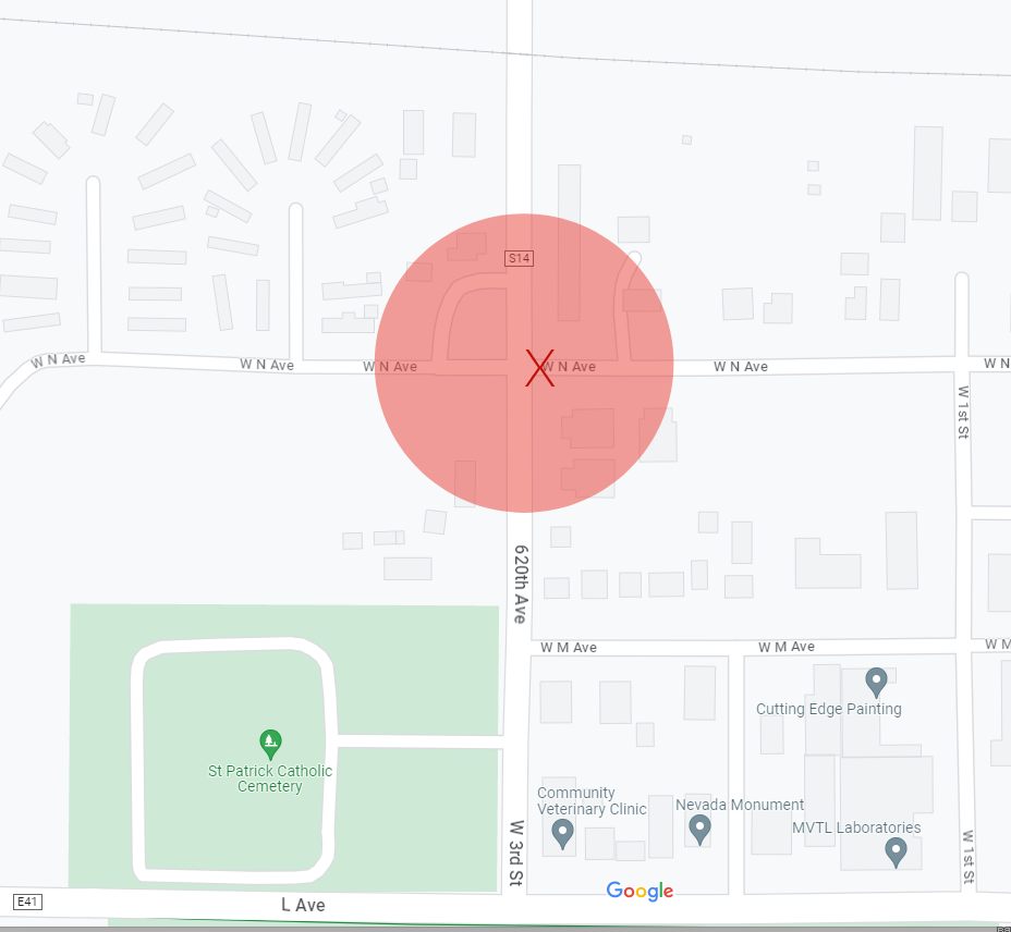 The closure first anticipated to be needed for just Monday and Tuesday of this week, will now take longer, possibly several weeks. This closure is on the west side of town at S-14 and N Avenue, and the closure means access from S-14 onto N Avenue (going east) is closed (as shown by the red X).