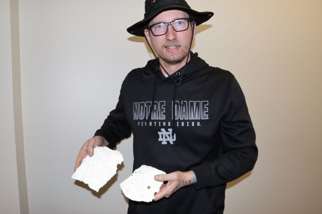 City Building and Zoning Official Ryan Hutton is shown with a few pieces of paint that pulled away from the road surface in recent months. Ryan explained that the paint first used at the completion of the downtown construction project was not adhering properly to the road surface and was breaking away in many places. So, at no additional expense to the City, the contractor has come in this spring to repaint all the lines in the downtown using a paint that should now adhere and hold for up to four years, and hopefully longer.